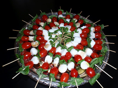 A great way to serve caprese salad while entertaining. I halved the mozzarella balls and arranged them with cherry tomatoes and basil leaves in an alternating pattern. I then aligned the skewers on a platter and lightly drizzled olive oil and balsamic vinaigrette over the top. Not only is this a delicious and healthy dish, but the radial pattern is pleasing to the eye and makes for a great presentation with such vibrant colors.