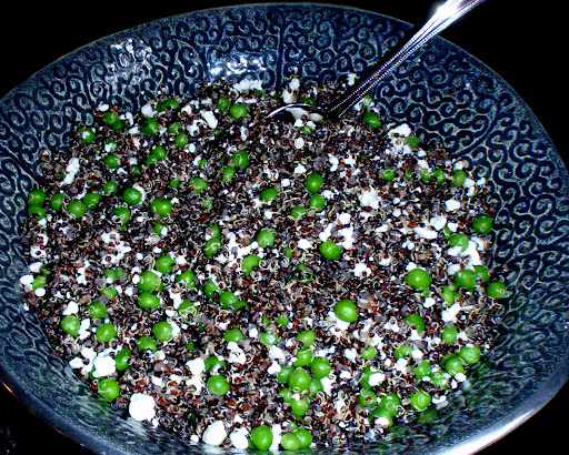 This is one of my favorite dishes of all time. At one point my husband and I decided to explore the world of grains beyond our usual starches, for me being Ukrainian, potatoes, and for him being Italian, pasta. We started with couscous, meddled down to buckwheat, an oldie for me but a new discovery for Jerry, ran into some risotto and barley and then stumbled upon black quinoa. Quinoa doesn’t have as much nutritious value as I wish it did, but it is high in fiber and has some iron, so take note. The fist time I made it I didn’t know what to expect, I boiled the grain in a pot according to the directions. I added just a pinch of salt into the water, a teaspoon of olive oil, some garlic powder, and simmered it until it was cooked. Not sure of how it was even going to taste I set it aside to cool, I then stared at my fridge/freezer for what I can add to that rich black color….frozen peas, why not? My husband swears the crumbled goat cheese was his idea, but I remember otherwise. Regardless, I added the goat cheese and the dish immediately came to life and became one of my favorites.I prefer this dish at room temperature because I feel the goat cheese flavor really compliments the quinoa better in crumbles than when it melts.