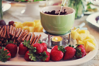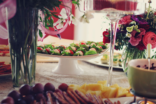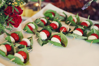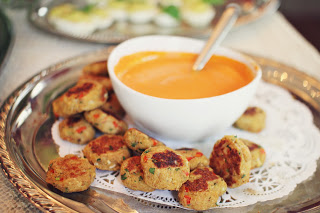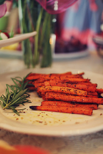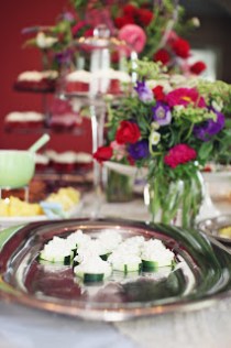 I found a lace tablecloth which turned out to be too short for my table, but thanks to the ideas of other creative minds I draped the lace over another tablecloth to get the vintage look I wanted. The food was a joy to plan as well; I wanted a lot of healthy finger food, it was a girls event after all. The recipes to all the dishes mentioned can be found at the end of this blog post. Instead of the regular caprese salad I saw a neat idea on Pintrest where the basil leaf was wrapped around the tomato and mozzarella creating a sort of boat. Not only does it look very appealing but this is a great way to keep the drizzled olive oil and balsamic vinaigrette flavor as it runs down into the ‘boat’. Fresh cucumber slices with a dollop of delicious feta cheese and Greek yogurt was another great idea I got from Pintrest. The baked carrots with thyme were probably one of the favorites of the day. This recipe is unbelievably easy and absolutely delicious, my husband even loved it and he’s not a carrot fan.