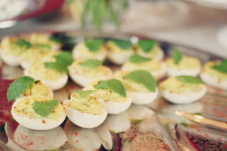 Directions: Cut boiled eggs in half lengthwise and carefully scoop out yolks. Mash yolks with a fork in a bowl. Stir in diced avocadoes, mayonnaise, lemon juice, garlic powder, cayenne pepper, and salt to taste. Transfer the yolk mix into a plastic baggie, cut a small hole in one of the corners and fill the egg withes with the mixture. sprinkle cayenne pepper over the eggs. I added a mint leaf to each egg to give it a unique burst of flavor.