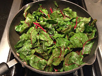 3. Once I felt the tomatoes were softened enough, about 8-10 minutes, I first shaved some garlic into the pan and then piled the Swiss chard on top. I then covered the pan with a lid so the chard would wilt. When the Swiss chard was wilted enough for my taste I threw in some fresh basil from my mini balcony garden, which is doing great by the way, and mixed it all up very well with the tomatoes. By this time the tomatoes were beat down enough where they released a lot of juice and I stirred the Swiss chard in the tomato juice.