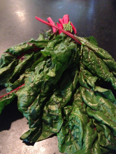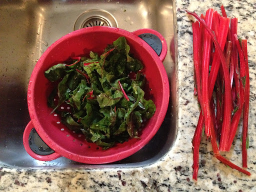 Growing up in the north I never had red Swiss chard, kale, or any of those other greens, it was pretty much just spinach. Since I’ve moved to the south I’ve been exposed to a slew of different types of greens. Memorial Day weekend we went to visit Jerry’s uncle in Beaufort, NC where his wife Julia cooked some truly wonderful meals for us. She grew her own Swiss chard and one day we had sauteed Swiss chard. I bought some red Swiss chard yesterday and prepared it for dinner very similarly to how she made it. Thanks for the idea and lesson on Swiss chard Julia!
