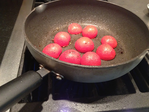 2. I then preheated a pan, lightly drizzled it with olive oil, halved some vine tomatoes, and placed them flat side down on the pan to brown a bit. As they lay on the pan I sprinkled some salt and pepper on them. After a while I would move them around to keep them from sticking to the pan, but I kept the flame big enough to make sure they got browned.