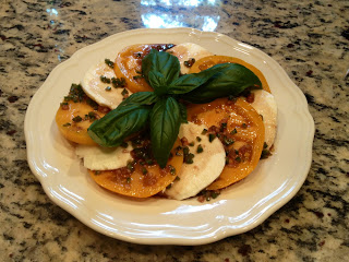 Dress up your caprese salad with this spicy dressing. I used big yellow tomatoes, any color/size tomatoes will work for this dish, and I bought fresh large buffalo mozzarella balls in water and slices them about as thick as the tomatoes. To season it all I made up this dressing.