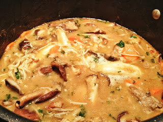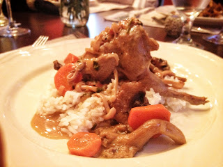 When the quails are done, remove them from the cooking liquid and keep them warm while you boil the juices, uncovered, to reduce the thin sauce consistency. Add the mushrooms and carrots to the sauce once the sauce has reduced to the desired consistency. Serve over Jasmine or whatever is you favorite type of rice.
