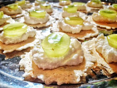 On Sunday I had the pleasure of hosting a family dinner party. My mother-in-law was in town for the weekend so I invited family from Atlanta to join us for dinner. Entertaining large groups of people is fun, but these sit down dinner parties are far more enjoyable for me. I make fewer dishes which gives me the opportunity to really pair them up in a way to compliment the others. For an appetizer I made grape and ricotta bites. I found a similar recipe on food network a while back and just kept it around until I could use it. The food network recipe uses cornmeal blinis whereas I used plain crackers. This is an easy recipe that makes a great impression for its uniqueness.Sweet Grape & Ricotta Bites