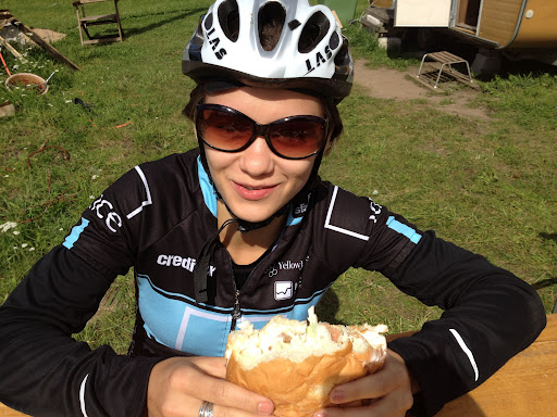 All that stuff in between the two pieces of bread was what they called a hamburger. The creepiest part of it all was the “meat”. Looked like some creepy, super processed, will never go bad on you, genetically engineered from scratch flat patty of stuff, I’m certain there was no meat involved and on top of that doused in some mayo looking sauce. I say all these things now, when I am well fed and couldn’t be found eating that if someone paid me, but I did eat that sandwich, I ate about 1/3 of it and then developed a stomach ache. [JP: I ate all of mine. I didn’t like it at all but a) I’m disgusting, b) I’m a bit gluttonous and c) I have inestimable gastrointestinal fortitude.] We decided to turn around there instead of pedaling on to the forest. On the way back we took the less scenic route during which I puked most of what I ate of that awful sandwich. I’ve become quite a pro at vomiting while cycling, I don’t even have to stop to do it anymore. I know just when to turn my head and the exact angle it needs to be at in order to maintain my speed and not disrupt my sleek aero position. [JP: and I ride in FRONT of Natalya and just fart… it’s kinda a compromise of minimal aggregate damage.] <–Yes, that happened a lot…