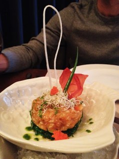 Salmon tartar over a mix of seaweed salad and