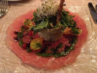 | Beef tartar with salad greens. |