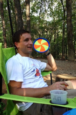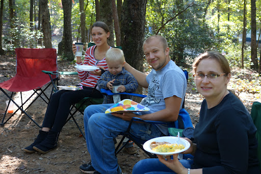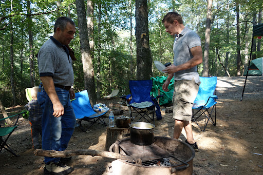 I began Saturday morning with a short jog. It was a beautiful day and by the time I got back and showered Kristina was done with making pancakes and Luda was making omelets in a bag. To make the pancakes Kristina pre-mixed the the pancake batter and poured it into a bottle with a funnel which she kept in her cooler. This made it easy to pour the pancake batter on the hot pan over the bonfire. For the omelets Luda chopped up all the topping (bacon, onion, bell pepper, broccoli, chives, and cheese) and beat the eggs in a separate bowl. Everyone then got a heavy duty freezer bag with their name on it to fill with whatever ingredients they wanted and top it off with the beaten egg. Meanwhile, we brought a pot of water to a boil over the bonfire and once it was boiling we took turns throwing in several omelet bags in at a time. The recipe said to keep them in the water for about 13 minutes, but we found that only really worked for the small omelets, the bigger ones took more time.