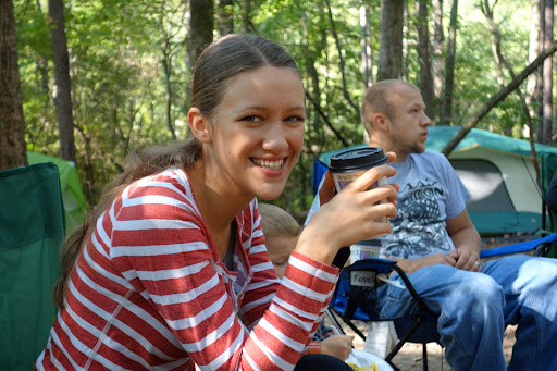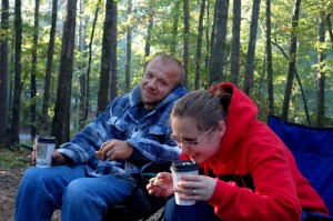| Paul and Luda enjoying a cup of coffee and some laughs in the crisp morning air. |