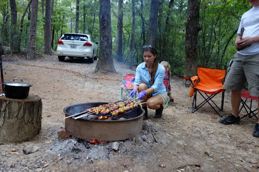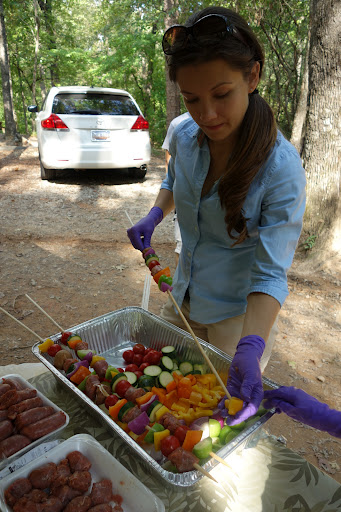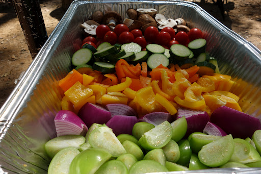 After we all had had enough hiking and were getting hungry we headed back to our camp site where it was my turn to prepare lunch. Kristina made some yummy appetizers by sauteing onion, mushrooms, and hearts of palm and putting them over bread and cheese. Yum! I cut up a whole bunch of veggies for kabobs.