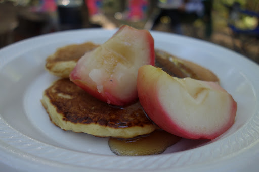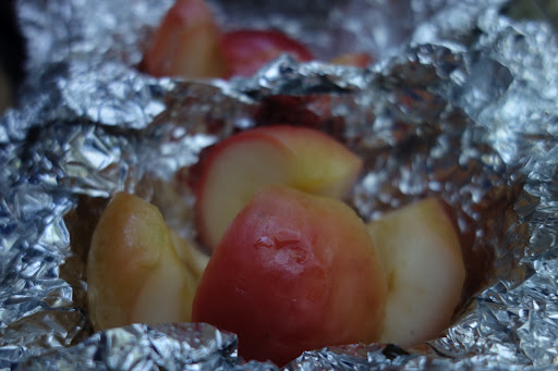 Day 3 was significantly cooler than day 2. Wrapped up in layers we rewarmed left over pancakes. We also had some apples laying around so I thought I’d make some roasted apples for our pancakes. I quartered, cored, and sprinkled sugar lightly over the apples (I wish we had some cinnamon). I then put the 4 pieces back together and double wrapped them in foil. The apples went on the grill and for the most part we tried to keep them away from the direct flames so they wouldn’t burn. Once they felt pretty soft we took them off the grill and enjoyed them over our pancakes with some syrup. It was so yummy. The combination of the crisp morning air and the roasted apples really made it feel like fall.