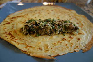 6. To roll the crepes, place about 3 tbsp of the meat filling onto the crepe.