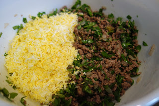 5. In a large bowl, combine the chopped spinach, the cooled beef, and the finely grated eggs. Mix well.