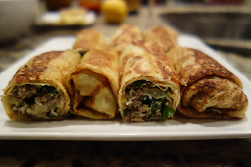These crepes are a delicious side to serve with a brothy hot soup on a cold winter day. I used to fill them with onion, beef, and egg alone, but recently added spinach (thanks for the idea Kristina!) and capers to the recipe. These can be eaten with sour cream or some fresh lemon, I much prefer the latter.