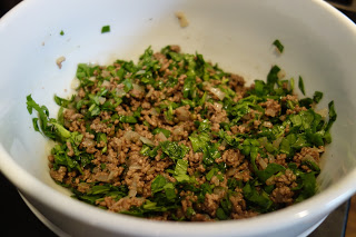 4. To prepare the filling, start with sauteing the onion. Once the onion if fairly translucent add your ground beef. Mix and break apart the ground beef to ensure it crumbles properly until it is thoroughly cooked. Season with salt and pepper to taste. Set aside to cool.