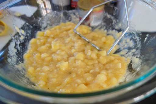 2. Mix in one egg at a time and then add the mashed bananas to the mixture. Add the vanilla extract.