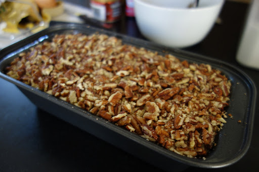 3. Combine all the dry ingredients separately, the flour, baking powder,baking soda, and salt. Gradually add the dry ingredients to the banana mix as it continues to blend. Add 1 1/2-2 cups of your chopped pecans (the remaining pecans will go on top of the bread).
