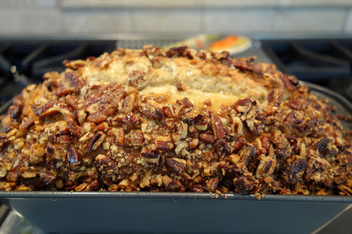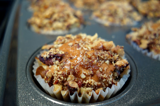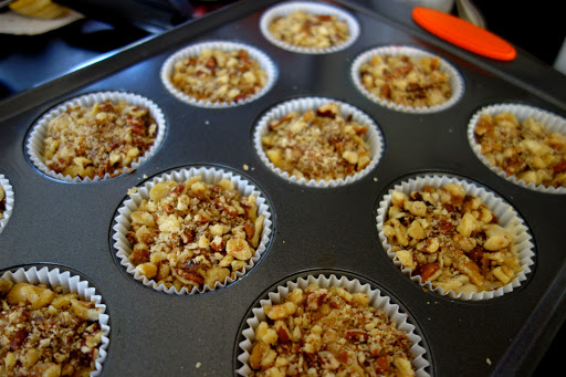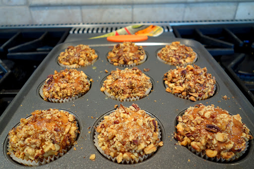 4. Transfer the batter into a greased bread pan and/or into a muffin tray. This recipe will make 2 8″x4″ loaves of bread, 1 8″x4″ loaf and 12 muffins, or 2 dozen muffins. Sprinkle the remaining chopped pecans over the batter. Bake the loaf at 350 degrees F for about 1 hour -1 hour & 15 minutes or until a toothpick comes out clean. The cupcakes will be ready a lot sooner, 35-45 minutes or until a toothpick comes out clean.