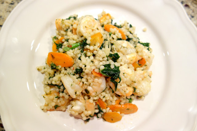3. Once the couscous is ready combine it in a large pot with the sauteed carrots, blanched kale, the chimichurri sauce, and the shrimp over medium heat. Mix thoroughly and keep cooking it until the shrimp are ready. Keep in mind not to overcook the shrimp, they cook very quickly. Serve hot with optional crushed red pepper for an extra kick and/or some grated Parmesan cheese.