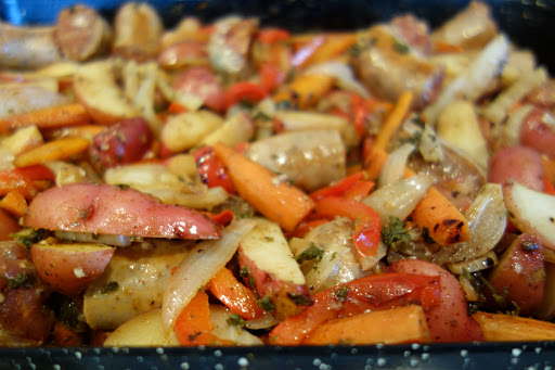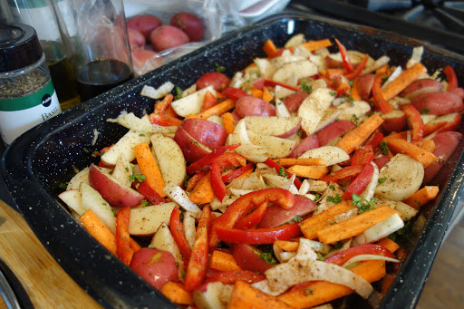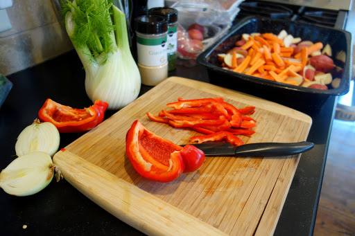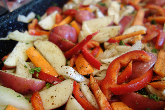 1. Preheat your oven to 450 degrees F. Thoroughly wash and dry the potatoes. Cut the potatoes into wedges, about 4-8 wedges per potato depending on its size. Peel the carrots and cut them into wedges about the same length as the potatoes. Next cut the bell pepper into strips. If your bell pepper is a very large one like mine was you might have to half the bell pepper strips to fit in with the potatoes and carrots.