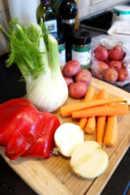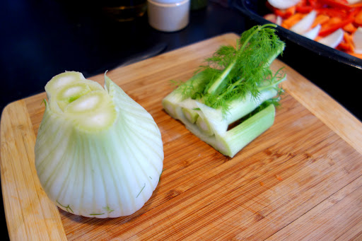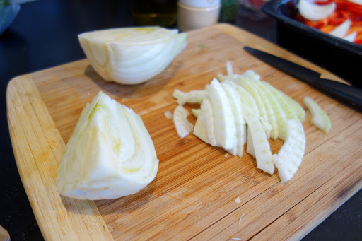 3. Peel your onions and cut them into wedges. I had about 6-8 wedges per onion. Add the fennel and onion to the potatoes, carrots, and bell pepper mix.