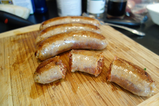 5. Meanwhile, brown the sausages in a skillet. You don’t need to cook them through all the way, just keep them on the skillet until they develop a nice brown color to them. Cut the 6 turkey sausages into 3 even pieces each.