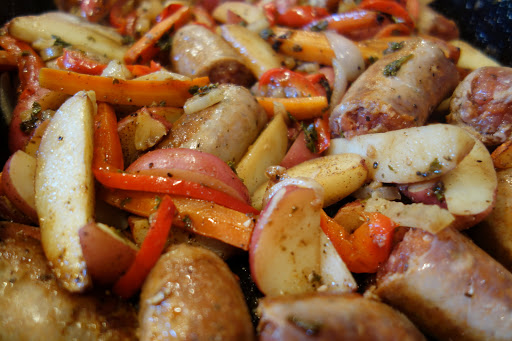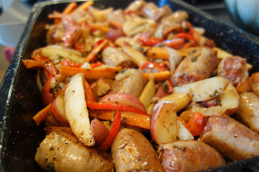 6. After 30 minutes of baking, pull the casserole out of the oven. The vegetables should be almost fully cooked. Mix the sausage in with the vegetables turning the vegetables over so they can bake evenly. Once you’ve added your sausage and parsley, pour the balsamic vinegar over the casserole evenly. Don’t hesitate to add some more chicken broth to the mix if the casserole seems a bit dry.