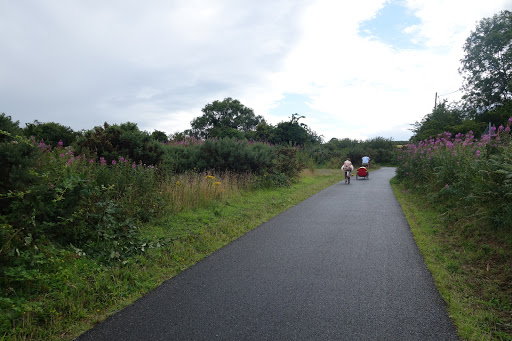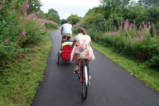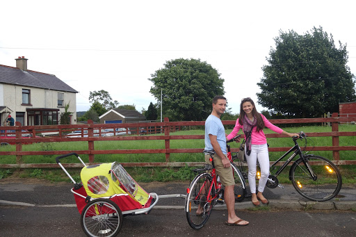 We rented some bicycles and a trailer for the wee that were dropped off at the hotel in the morning. Once Jerry got back from his century ride he got right back on the bike and we headed off to Comber. Comber is a small town southeast of Belfast connected by a pretty greenway. It was a mess trying to find the start of the greenway but we finally got on the Comber Greenway and enjoyed all the beautiful country views…the smells, not so much. The trailer was meant for kids a lot bigger than Cella. No problem though, we folded and rolled up towels to make her fit nice an snug in the trailer and I think she enjoyed it for the most part. We had planned to have dinner in Comber, but since we arrived a lot later than planned we decided against having dinner there. The last thing we needed was to get stuck on the remote Comber Greenway as it got dark outside. Our trip came out to be a 22 mile bike ride, far more than Lydia has ever bicycled. Lydia was a great sport about the whole ride and as Jerry put it “Ukrainians are good at suffering.”
