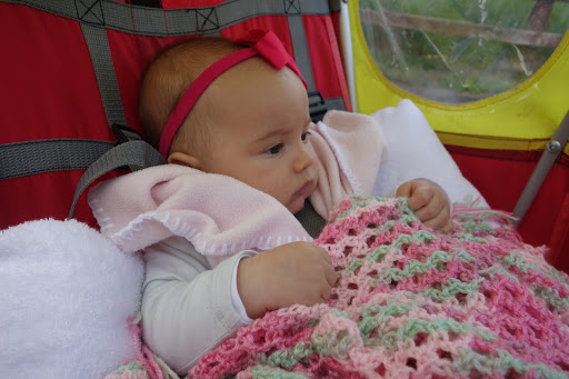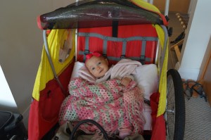 | The wee all bundled up and cushioned in the trailer. |