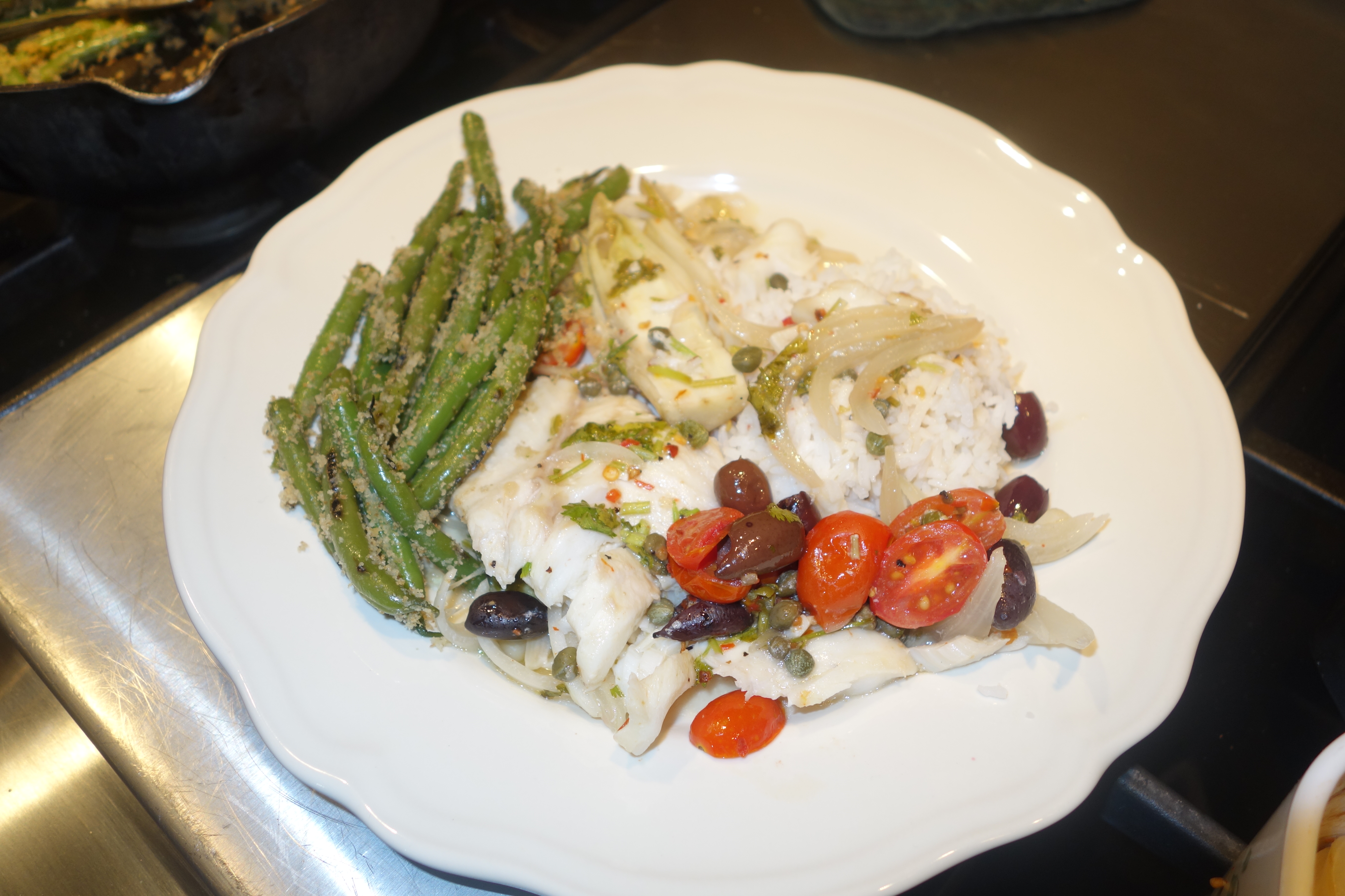 1. Preheat your oven to 350 F. Halve your endives, cut your onions into wedges, halve the cherry tomatoes, and chop your garlic and cilantro. Arrange half of all the veggies: endive, onion, capers, olives, cherry tomatoes, and garlic on the bottom of your baking dish. Sprinkle some crushed red pepper over the vegetables to give your dish the perfect kick.
