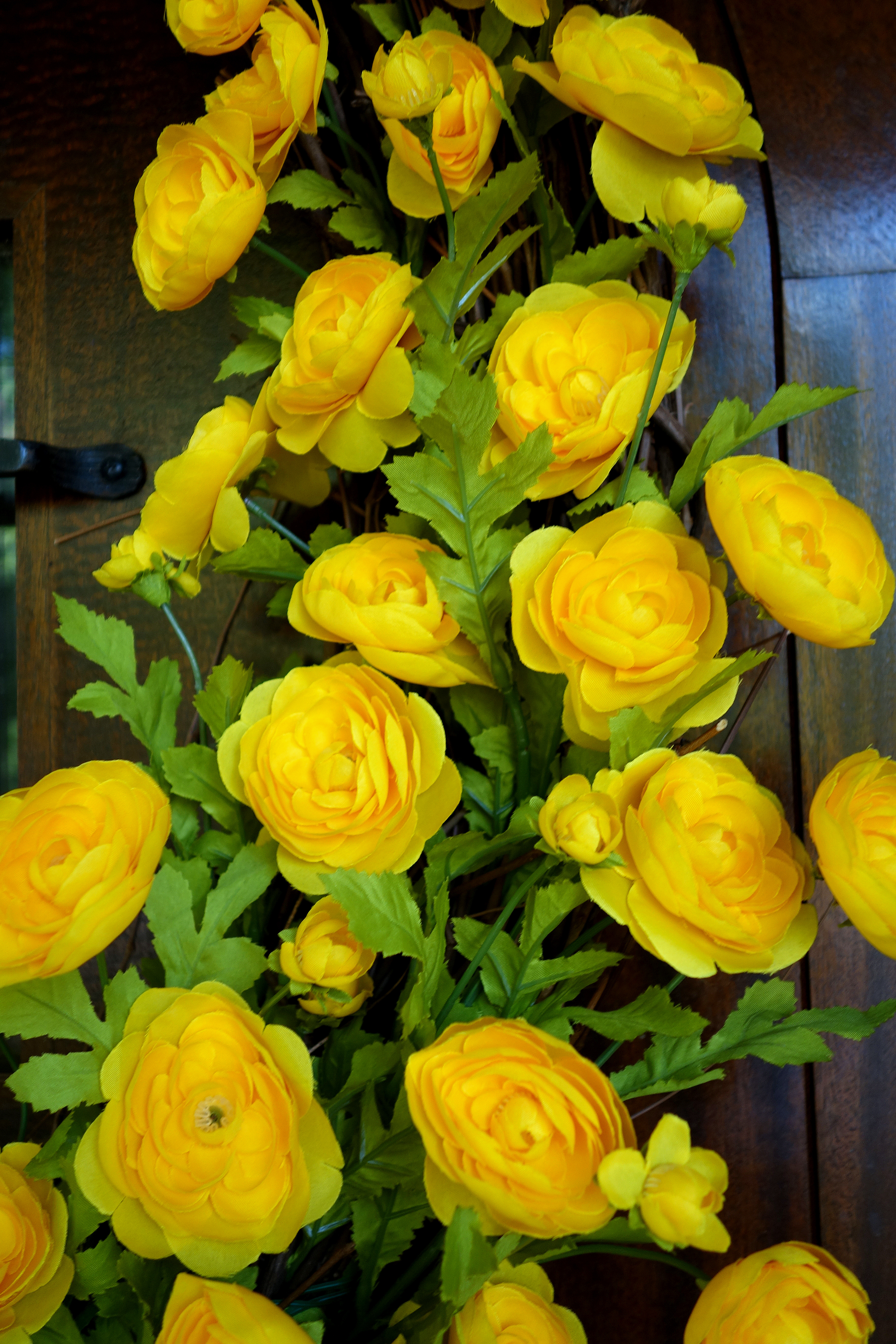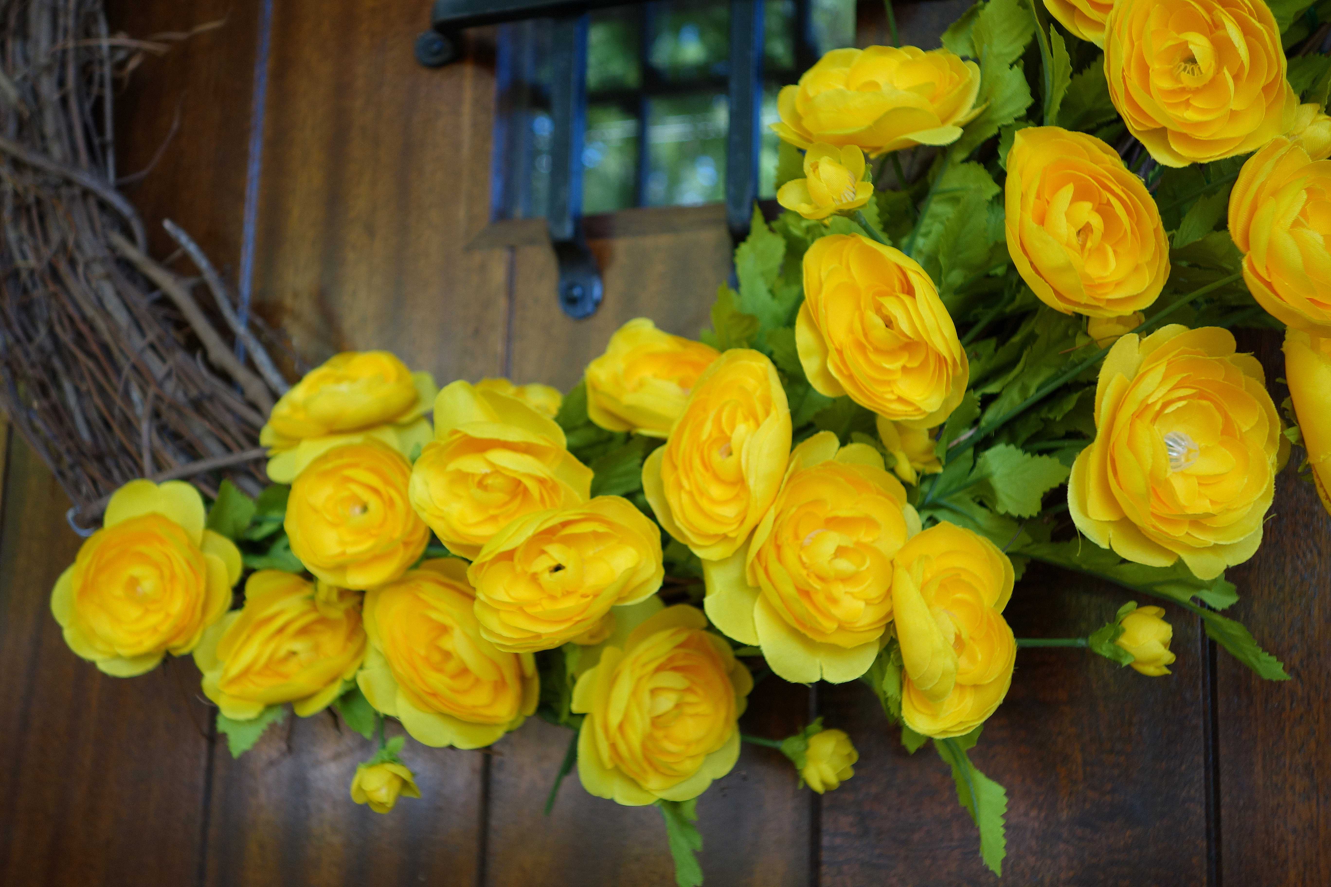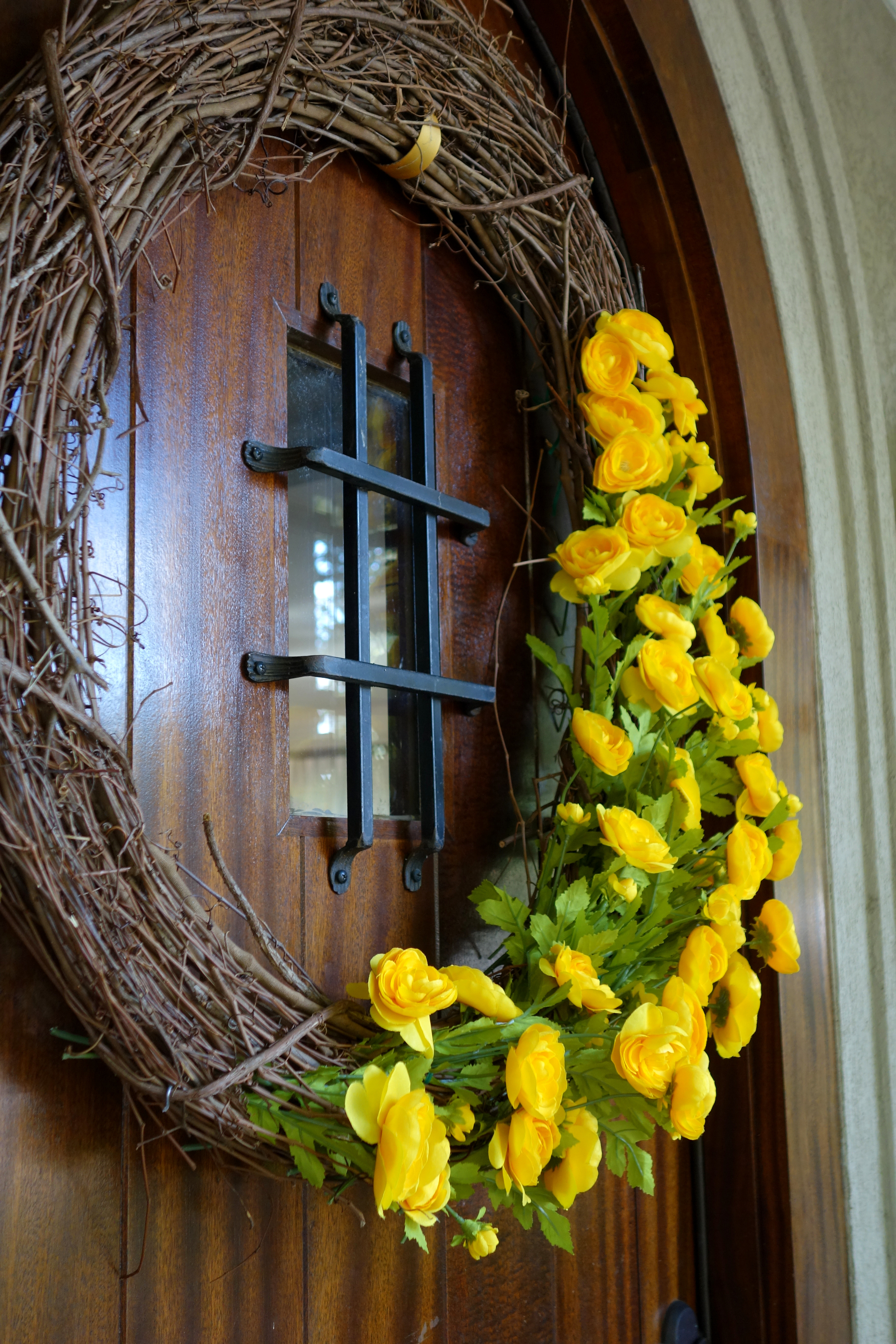I’ve been looking for a 32″ fall wreath for a long time, but couldn’t quite find one that was beautiful enough. Not to mention worth it . I went to Michael’s last week to pick up a few things when I ran across these beautiful yellow ranunculus. After I saw that they had a large 32″ twig wreath I decided to go ahead and make my own fall wreath. I got the twig wreath and all the ranunculus (21 stems with 3 blooms/stem). To make the wreath I cut each stem into 2 pieces and arranged the stems around an off-centered half of the twig wreath. Most of the stems fit pretty snug into the wreath, those that didn’t I tied down with some green wire. My front door has now embraced fall for a mere $70!