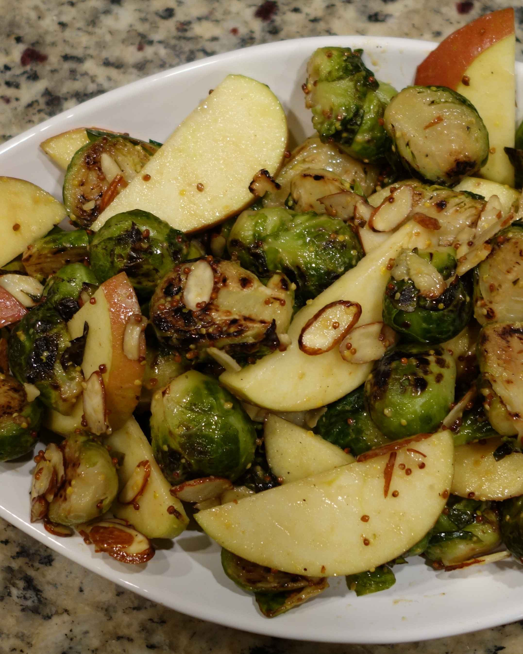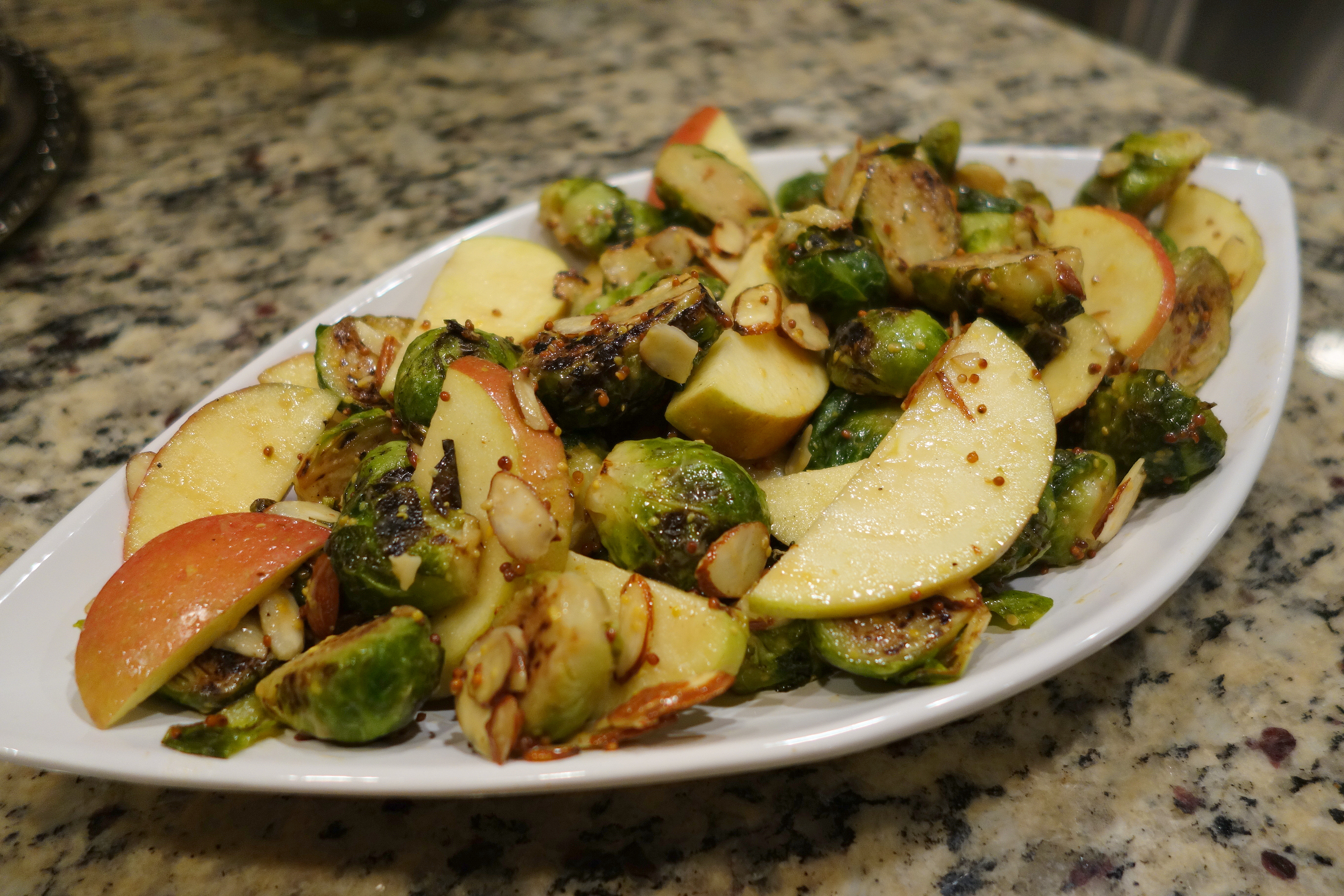 4. Once the brussel sprouts have cooled. Mix them in a large bowl with the apple slices, sliced almonds, and the salad dressing. Delicious fresh and even better as leftovers!