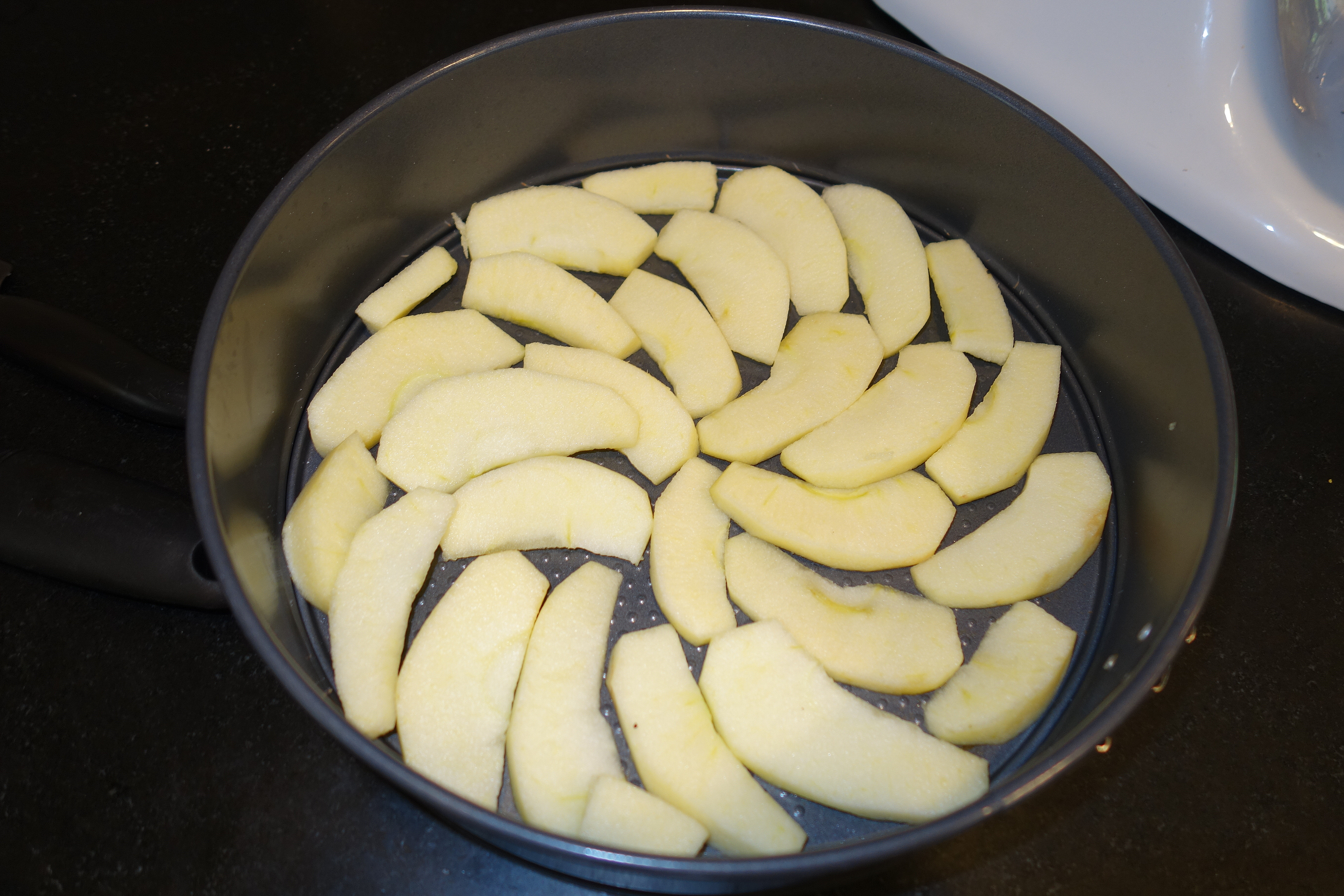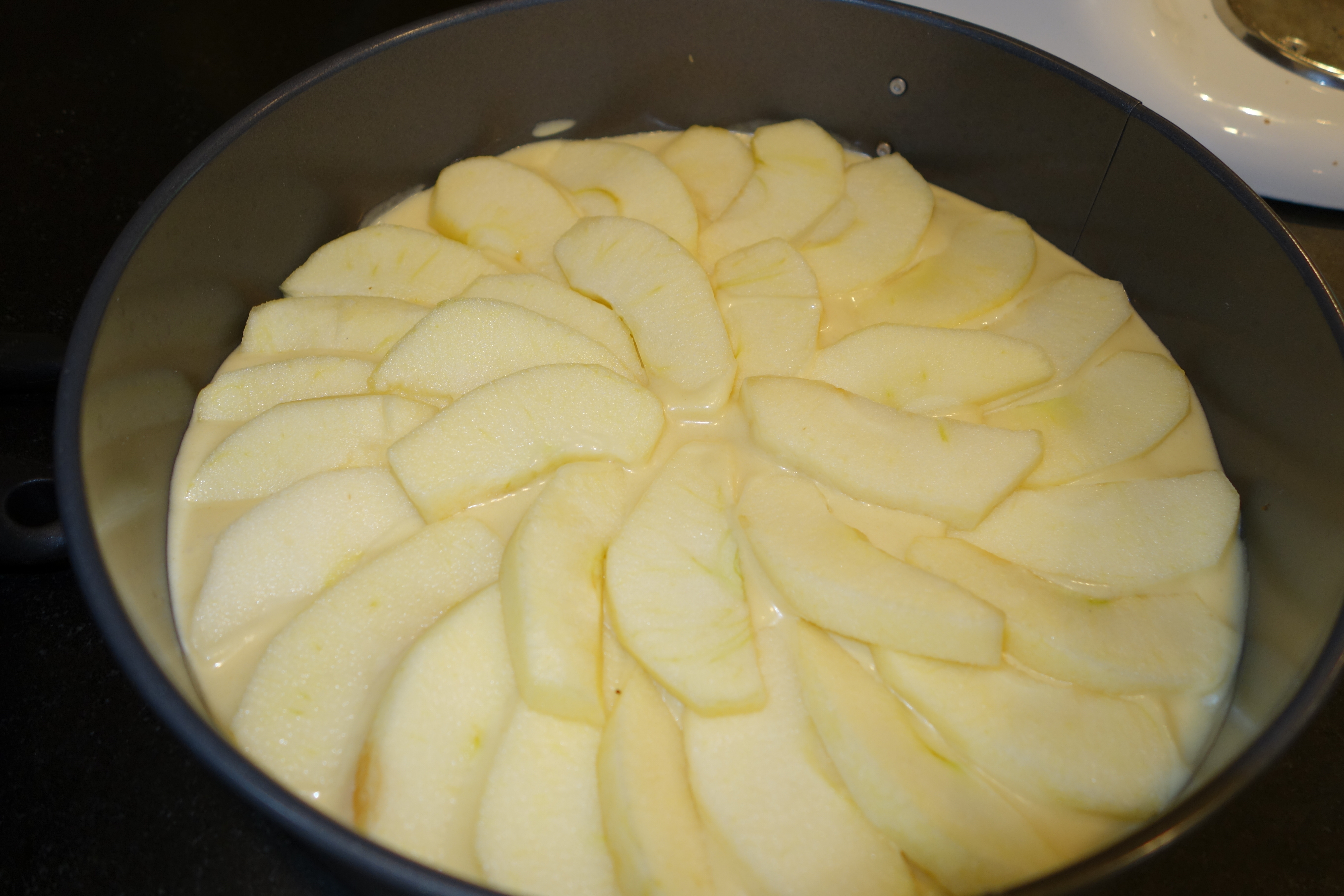 2. Make your cake batter.  Arrange your apple wedges in a radial pattern on the bottom of your cake pan. Using a large spoon pour the batter over the apples until the first layer of apples is just barely covered. Radially arrange another layer of apple wedges over the batter. Repeat this until you’re out of batter and/or apple wedges.