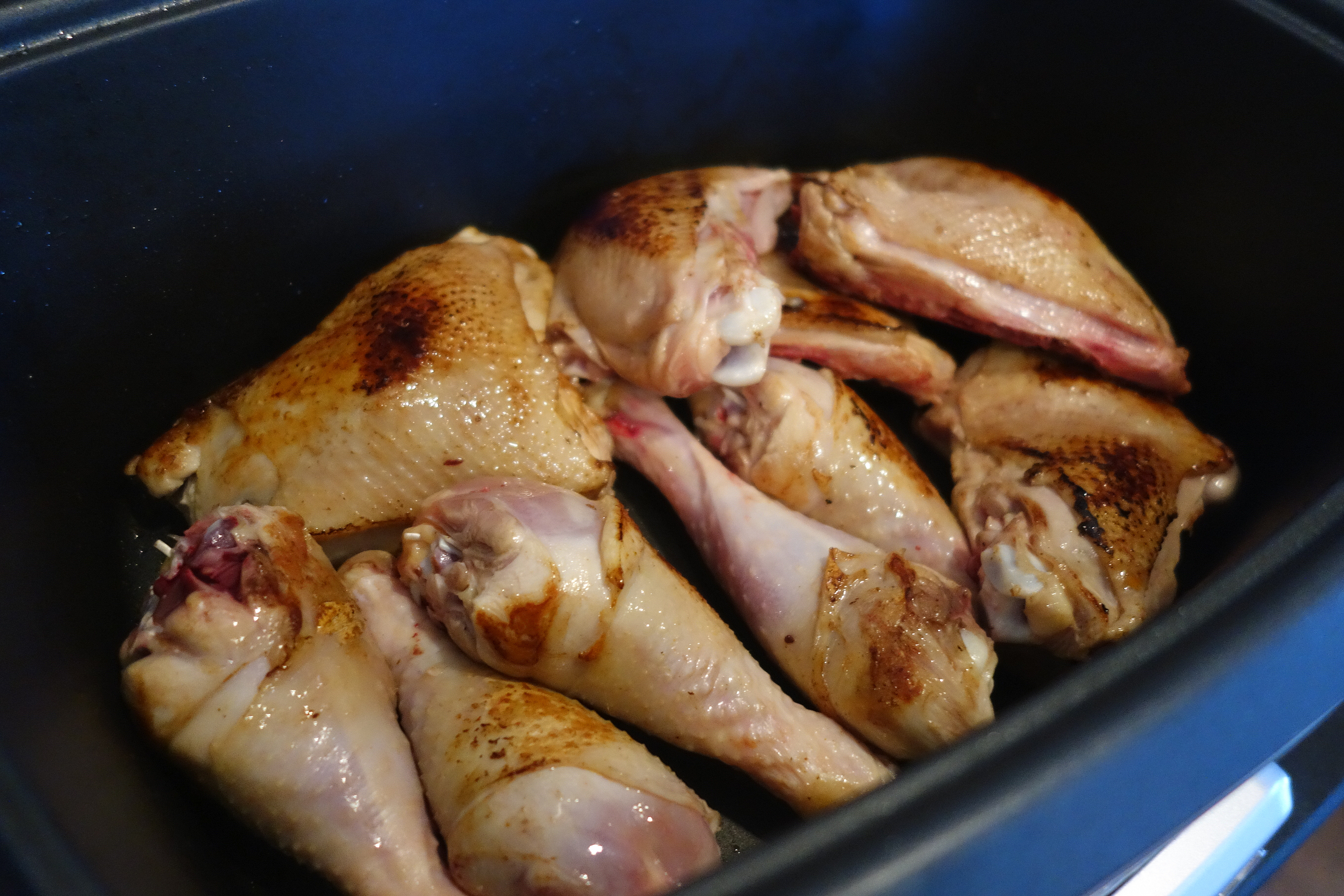 After 4 hours of cooking on low the chicken just falls off the bone.