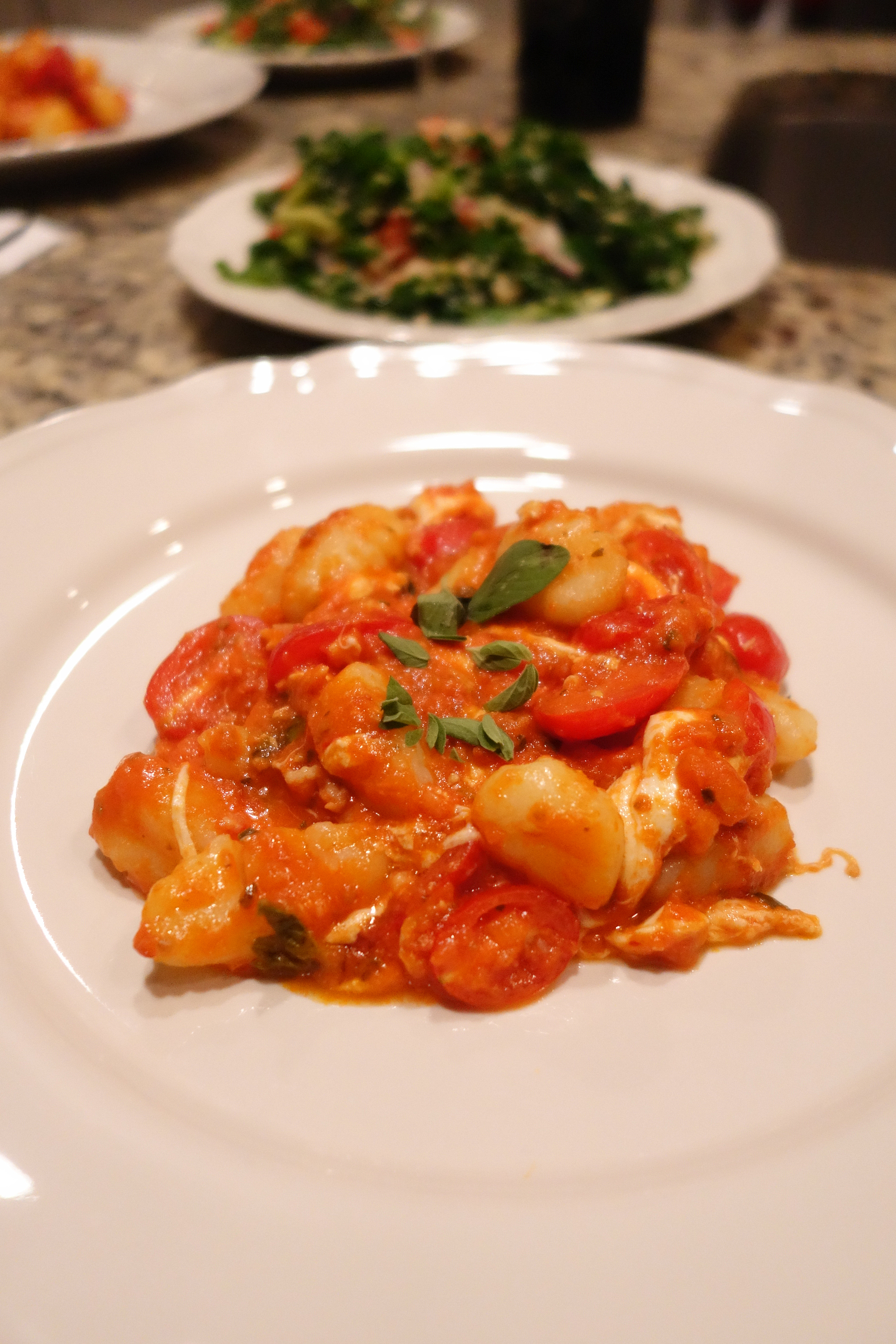 This dish makes a great hot dinner on a cold winter night. I usually make baked gnocchi without any meat but I have made it with spicy Italian turkey sausage before. It’s delicious either way. When I make it with meat I’ll fully cook the meat, let it cool off, and chop it up to about the same size of the gnocchi I’m using.