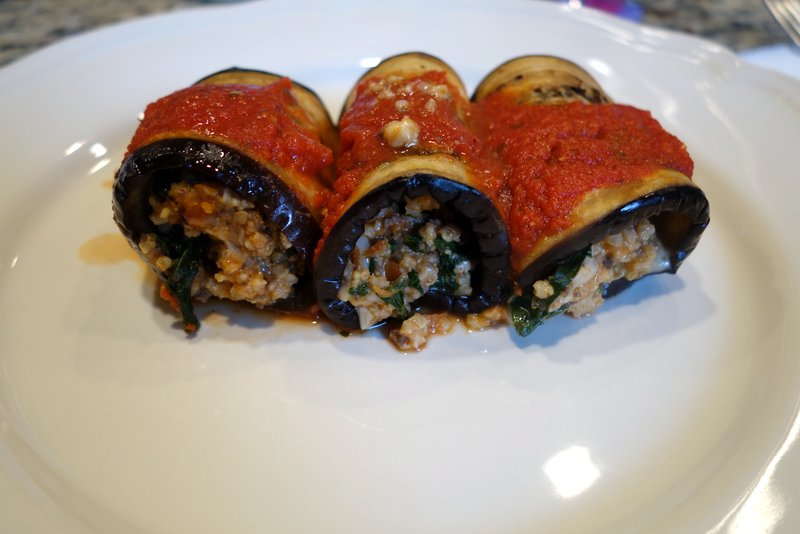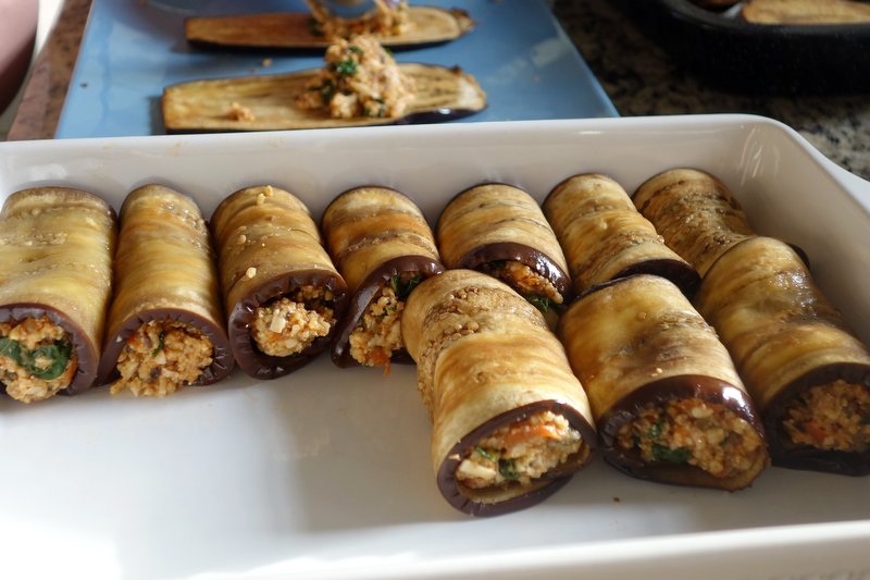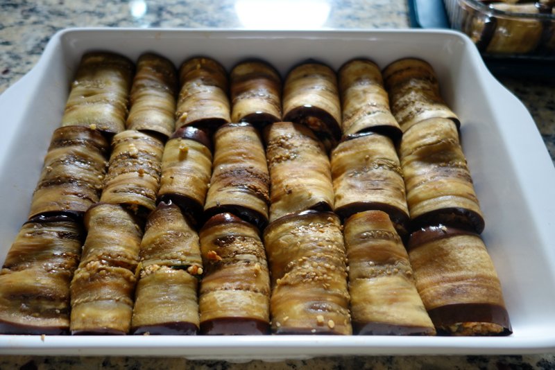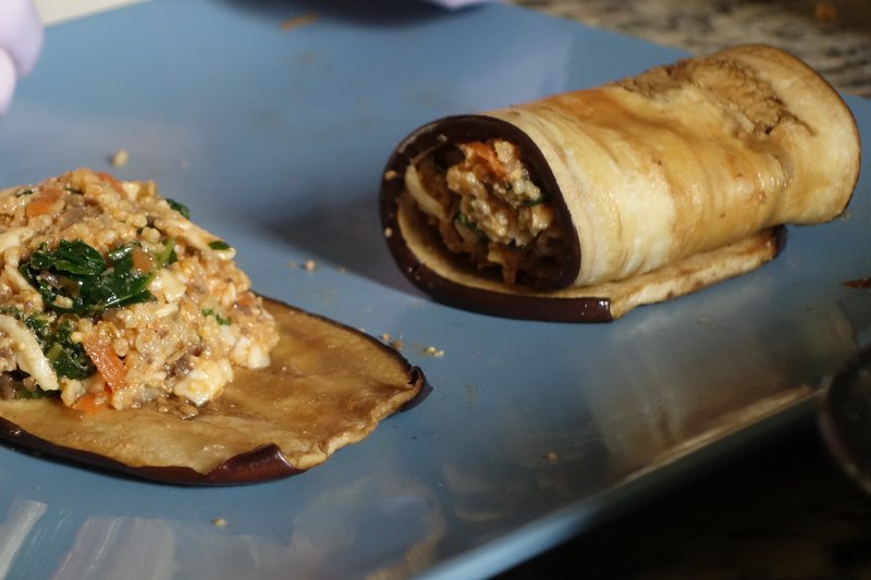 5. To assemble the rolls, begin with laying out an eggplant slice. Spoon about 2 tbsp of the stuffing on the widest part of the eggplant slice and roll the slice from one end as pictured below. Arrange the rolls tightly next to each other in a baking dish seam side down.