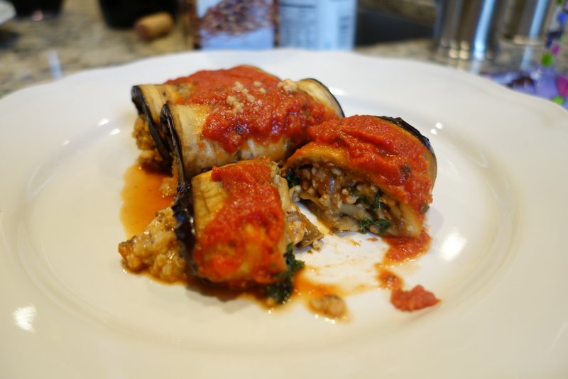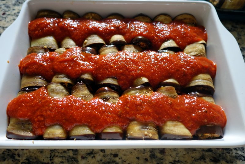 6. Pour the remaining 2 cups of tomato sauce over the eggplant rolls as pictured below. Bake at 350°F for about 40 minutes before serving.