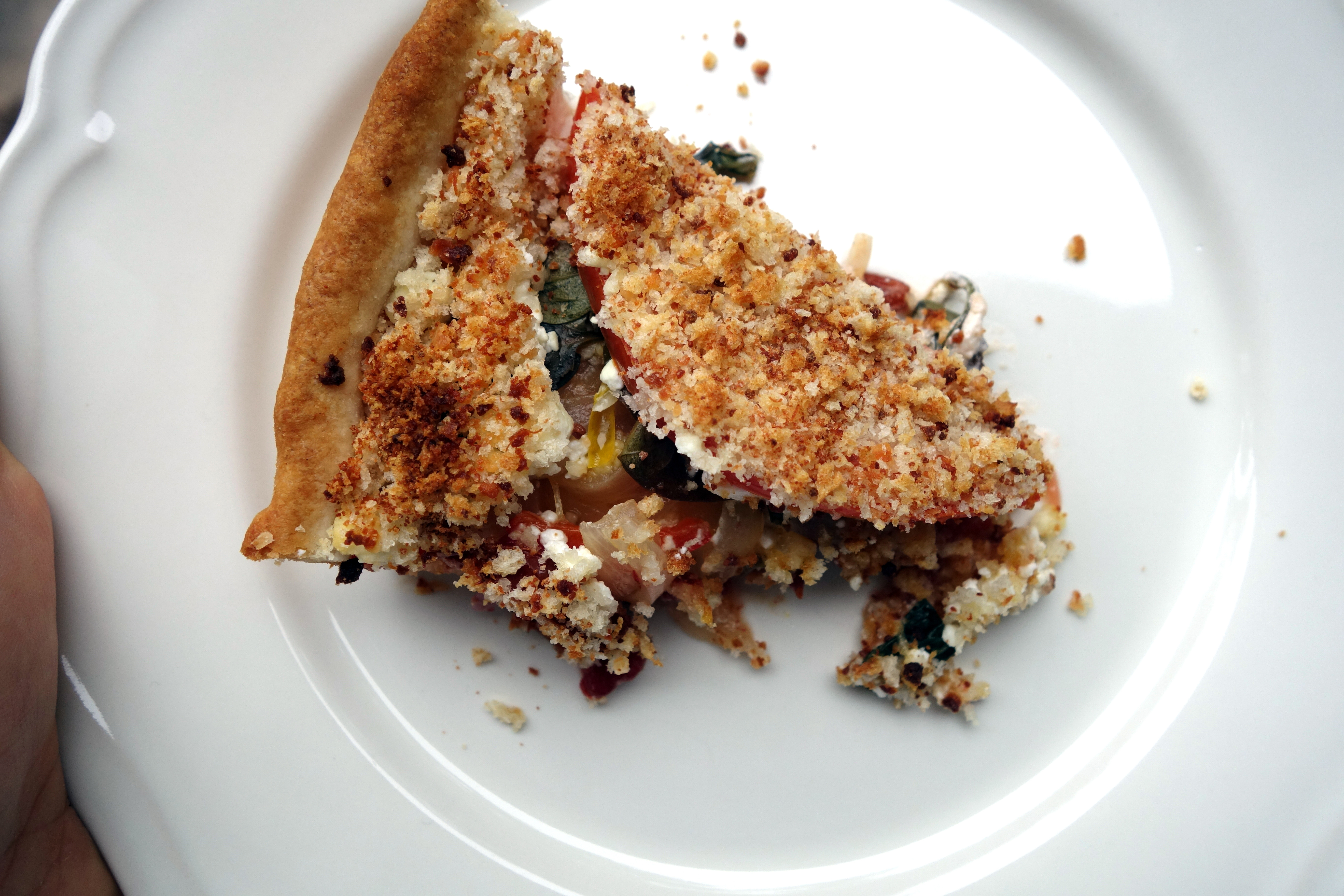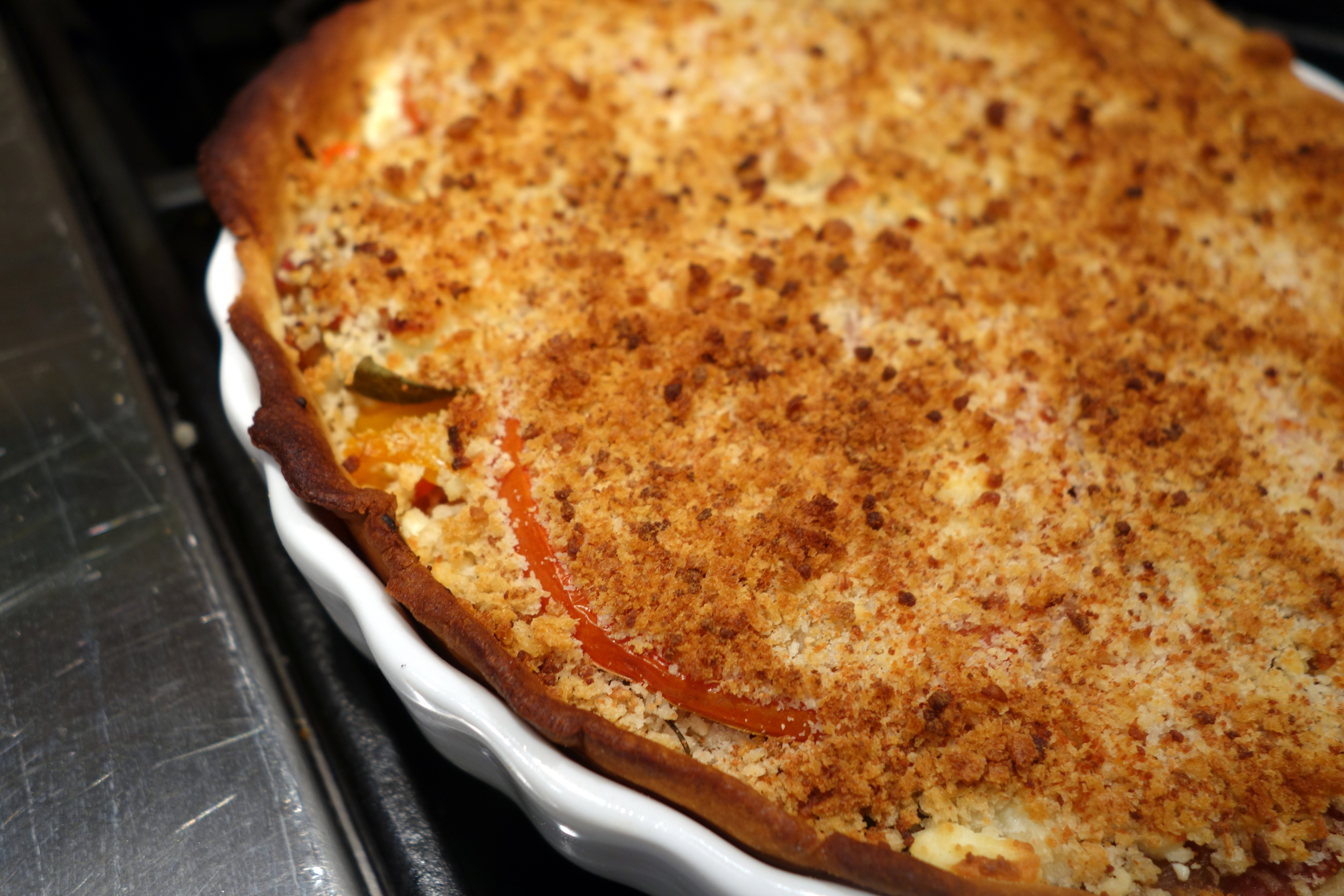 (5) Add any remaining goat cheese crumbles over the tomatoes. Combine the Panko breadcrumbs and the Parmesan cheese in a bowl. Cover the pie with all the breadcrumb and Parmesan mix.
